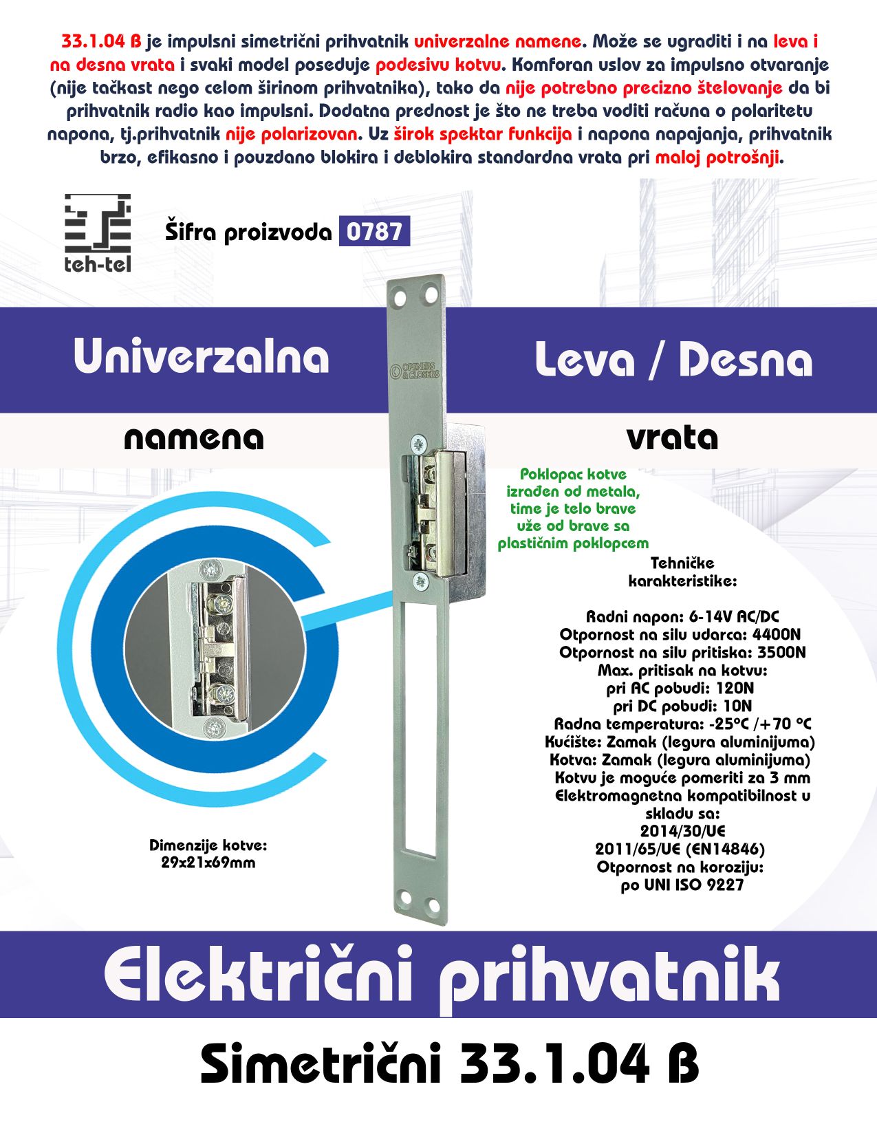 Teh-Tel univerzalni prihvatnik 33.1.04 B. Ovaj prihvatnik je impulsni i simetričan je. Prihvatnik se može ugraditi i na leva i na desna vrata i ovaj model poseduje podesivu kotvu. Dodatna prednost je što ne treba voditi računa o polaritetu napona, odnosno prihvatnik nije polarizovan. Uz širok spektar funkcija i napona napajanja, ovi prihvatnici brzo, efikasno i pouzdano blokiraju i deblokiraju standardna vrata pri maloj potrošnji. Kućište: Zamak (legura aluminijuma). Kotva: Zamak (legura aluminijuma)Kotvu je moguće pomeriti za 3 mm napred ili nazad. Elektromagnetna kompatibilnost je u skladu sa 2011/30/UE kao i 2014/65/UE (EN14846). Prihvatnik ima otpornost na koroziju:po UNI ISO 9227.