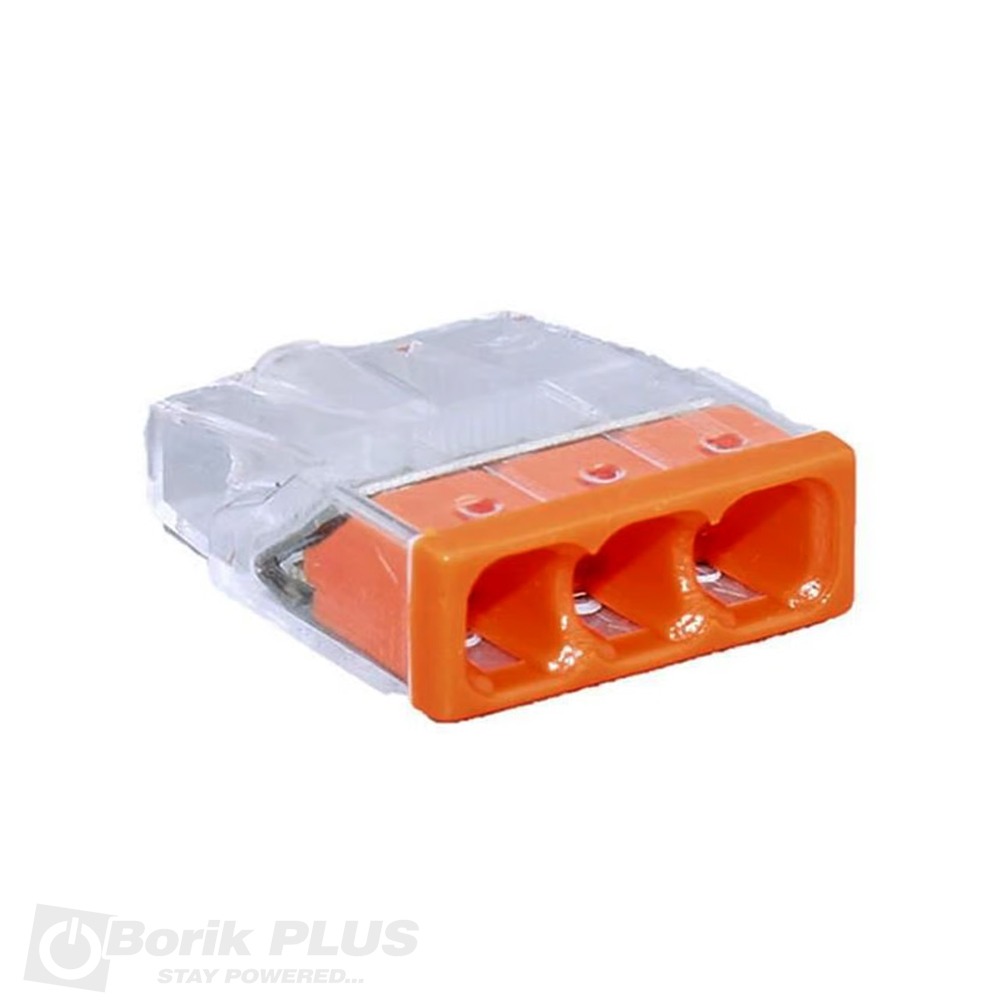 WAGO klema sa 3 rupe spojna bez poluge za napon do 450V i struju do 24A. WAGO klemice se prodaju isključivo na pakovanje od 5 kom i prikazana cena je za jednu kesicu od 5 komada. Ovaj model WAGO klemice može da obuhvati poprečni presek provodnika od 0.5 do 2.5 mm2 i može se koristiti jednokratno. Jednom uguran provodnik se ne može lako izvući bez oštečenja samog konektora. Kontaktni elementi su čelični, galvanizovani cinkom. Plastika izolatora unutar Wago konektora je bez halogena. Za upotrebu nije potreban nikakav alat osim što je neophodno oguliti provodnik toliko da kontakt u konektoru dodiruje ogoljen provodnik. Komplete stripera iz naše ponude pogledajte ovde.