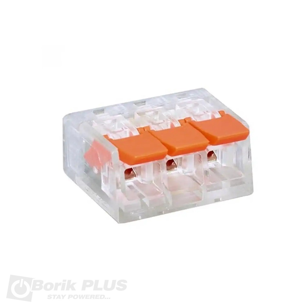 WAGO klema sa 3 rupe spojna sa polugom za napon do 450V i struju do 32A. WAGO klemice se prodaju isključivo na pakovanje od 5 kom i prikazana cena je za jednu kesicu od 5 komada. Ovaj model WAGO klemice može da obuhvati poprečni presek provodnika od 0.2 do 4 mm2 i može se koristiti više puta. Jednom uguran provodnik može se lako izvući otpuštanjem poluge bez oštečenja samog konektora ili provodnika. Kontaktni elementi su čelični, galvanizovani cinkom. Plastika izolatora unutar Wago konektora je bez halogena. Za upotrebu nije potreban nikakav alat osim što je neophodno oguliti provodnik toliko da kontakt u konektoru dodiruje ogoljen provodnik. Komplete stripera iz naše ponude pogledajte ovde.