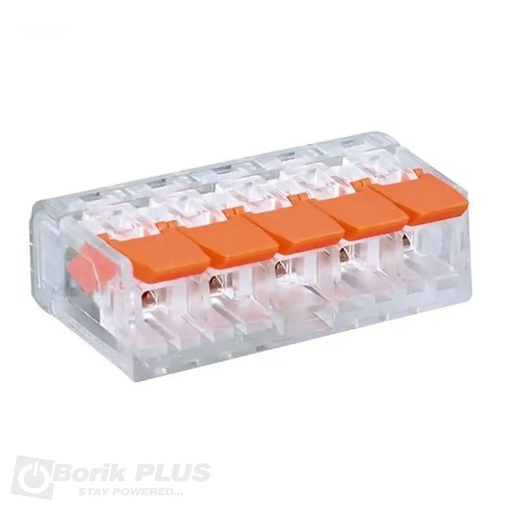 WAGO klema sa 5 rupa spojna sa polugom za napon do 450V i struju do 32A. WAGO klemice se prodaju isključivo na pakovanje od 5 kom i prikazana cena je za jednu kesicu od 5 komada. Ovaj model WAGO klemice može da obuhvati poprečni presek provodnika od 0.2 do 4 mm2 i može se koristiti više puta. Jednom uguran provodnik može se lako izvući otpuštanjem poluge bez oštečenja samog konektora ili provodnika. Kontaktni elementi su čelični, galvanizovani cinkom. Plastika izolatora unutar Wago konektora je bez halogena. Za upotrebu nije potreban nikakav alat osim što je neophodno oguliti provodnik toliko da kontakt u konektoru dodiruje ogoljen provodnik. Komplete stripera iz naše ponude pogledajte ovde.