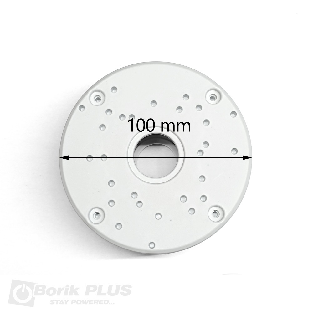 Manji aluminijumski OKRUGLI 6 BELI univerzalni nosač za kameru. Ovaj model nosača služi kao distancer za kameru u odnosu na površinu na kojoj se kamera montira. Na ovaj nosač se može montirati i DOME i BULLET kamera bilo kog proizvođača i bilo kog raspona rupa. Kablove ili video balune možete sakriti u kućištu. Kućište nije vodootporno pa je preporuka da se kamera i nosač montiraju na mestu gde nema zapljuskivanja vodom. Na ovaj model univerzalnog nosača može se montirati bilo koja kamera čija baza ne prelazi prečnik od 95 mm. Dimenzije i prečnik kamere koju želite da montirate imate na dnu svakog tehničkog lista. Nosač se za fasadu ili zid pričvršćuje sa 4 šrafa koji se ne dobijaju uz nosač.